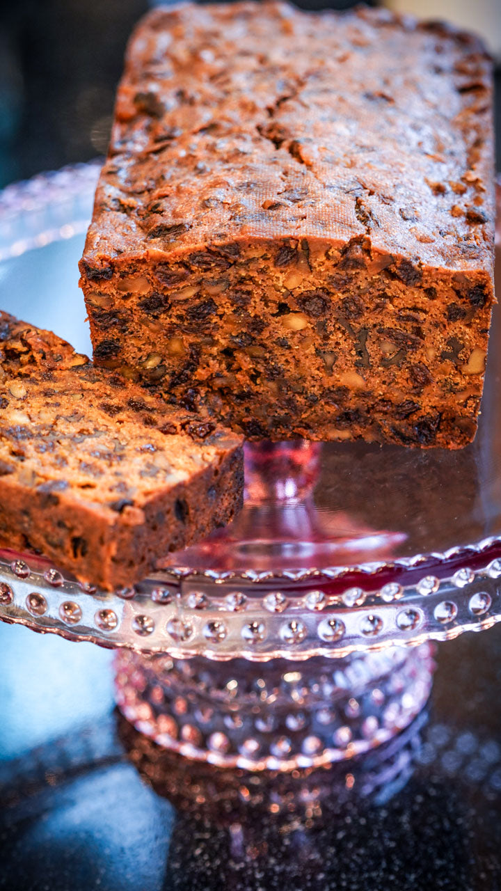 Ingredients: Organic Raisins, Walnuts, Cane Sugar, Wheat Flour, Amish Butter (pasteurized cream, sea salt), Organic Eggs, Molasses, Milk, Bourbon Whiskey, Organic Spice, Baking Powder, Baking Soda, French Celtic Sea Salt.