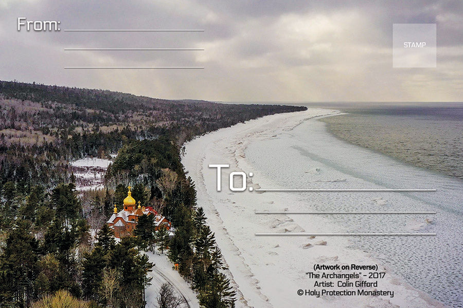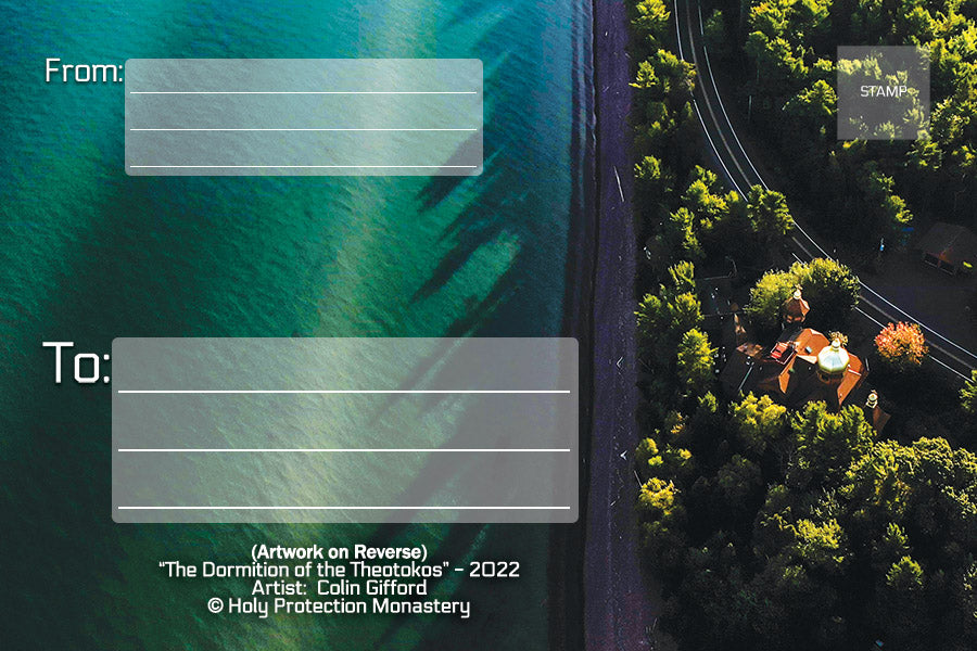 One card is dedicated to "The Dormition of the Theotokos", the second is dedicated to "The Archangels". The reverse side of each card has an aerial view of Holy Protection Monastery.